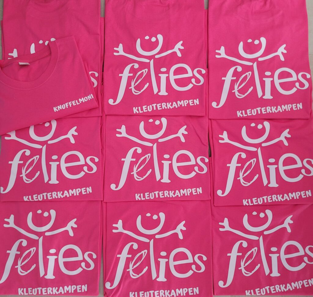 We persen de print op een hoge temperatuur van 160 graden op het gewenste textiel en verwijderen erna de folie zodat enkel de inkt op de kledij blijft.